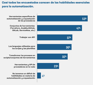 A medida que la transformación digital avanza, se necesitará más telemetría para entregar los insights necesarios para proteger las aplicaciones y brindarles a los clientes las experiencias que demandan. Una pequeña mayoría (un 56%) de los encuestados en América Latina dicen que tienen las herramientas necesarias para informar sobre el estado de las aplicaciones de negocios de alta prioridad. Sin embargo, casi todos tienen dificultades para obtener insights críticos. Mundialmente, el 95% de los encuestados informaron que les faltaban insights, en particular cuando se trata de las causas principales de los incidentes en las aplicaciones o la degradación del rendimiento. Poner en práctica esos conocimientos de manera eficiente también plantea retos, incluso si se cuenta con la ayuda de la automatización, ya que el déficit de habilidades preocupa a casi todos los encuestados de América Latina (un 96%). La falta de conocimientos necesarios para gestionar las herramientas de automatización y orquestación específicas de los proveedores es lo que más preocupa a más de la mitad de los encuestados. También indicaron que hay importantes carencias en los conocimientos para trabajar con otros conjuntos de herramientas y API. La complejidad de la arquitectura y la proliferación de aplicaciones no harán más que aumentar, lo que agravará los problemas existentes en cuanto a la disponibilidad de herramientas, habilidades e insights necesarios. Sin embargo,